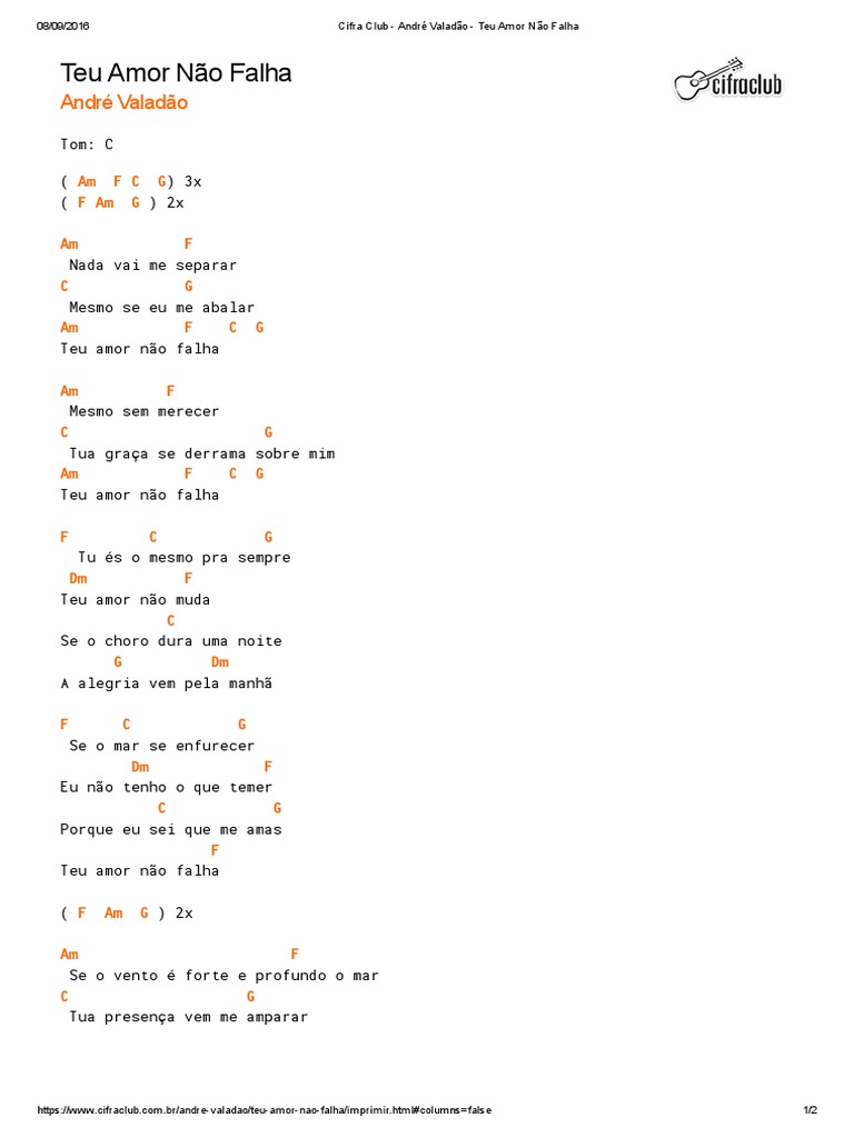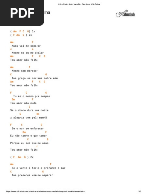 Trending Teu Amor Não Falha Cifra Simplificada F am g tu fazes que tudo, coopere para o meu bem. Teu Amor Não Falha Cifra Simplificada : 0 ratings0% found this document useful (0 votes).
